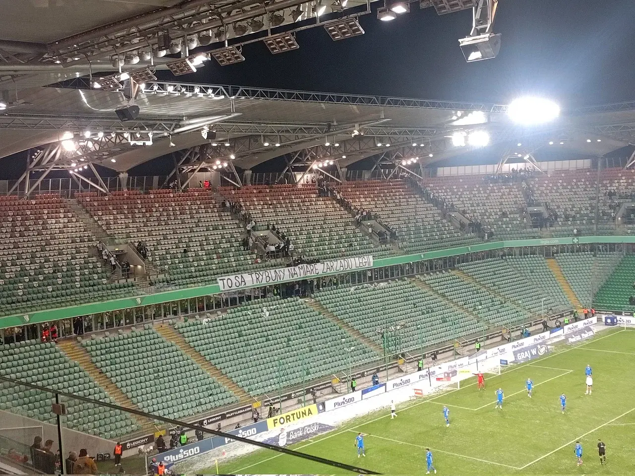 Fani Legii od dawna nie kryją swojego rozczarowania wynikami drużyny i sytuacją w klubie. Tym razem postanowili wyrazić to w sposób symboliczny - przez kwadrans nie było ich na trybunach, co stworzyło dość nietypowy obraz dla oglądających spotkanie. Na "Żylecie", czyli sektorze zajmowanym przez najbardziej zagorzałych sympatyków, pojawił się wymowny transparent: „To są trybuny na miarę zarządu Legii”
